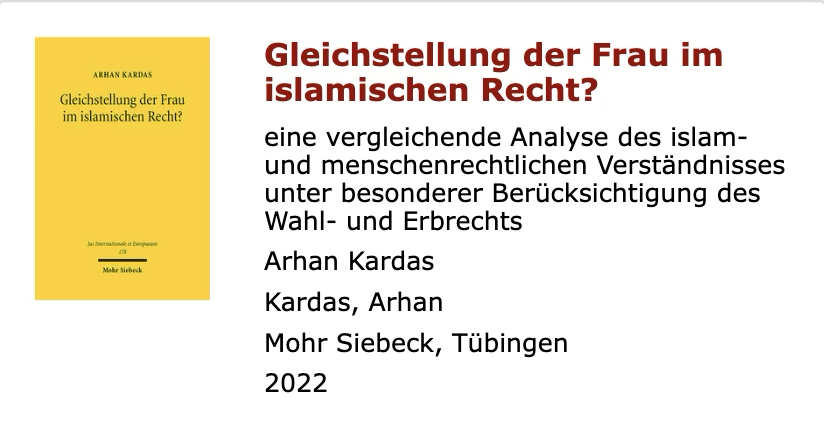 Dr. Kardaş’ın doktora tezi; kadın hakları, miras ve siyasal haklar gibi temel konuları, klasik İslami kaynaklar ve modern insan hakları perspektifiyle derinlemesine inceleyen önemli bir akademik çalışmadır. Günümüzde Potsdam Üniversitesi bünyesinde İslam, tefsir ve insan hakları alanlarında dersler veren Dr. Kardaş, aynı zamanda Islamische Akademie für Bildung und Gesellschaft e.V.’nin Yönetici Başkanı olarak sivil toplum projelerine liderlik etmektedir. Çok dilli birikimiyle uluslararası platformlarda yayınlar yapmakta; toplumda bilimsel düşünce, adalet ve diyalog kültürünün yaygınlaşmasını hedeflemektedir. Dr. Arhan Kardaş yayınlanan Doktora tezi: Metnin Türkçe çevirisi şöyledir: İslam Hukukunda Kadın-Erkek Eşitliği? Seçme ve Miras Hukuku Özelinde, İslam Hukuku ile İnsan Hakları Anlayışının Karşılaştırmalı Bir Analizi Arhan Kardaş Kardaş, Arhan Mohr Siebeck Yayınları, Tübingen 2022 |